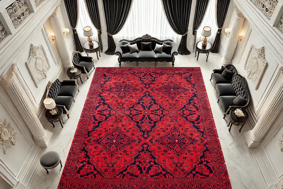Crimson Pavilion evokes the majestic elegance of royal courts, where symmetry and opulence define every detail. This rug features grand medallion motifs intricately laid across a deep crimson and midnight blue canvas, creating a harmonious interplay of bold contrast and refined craftsmanship. Inspired by the legacy of palace interiors, it reflects the artistry of ancient cultures reimagined for modern living. Designed with practical features including a non-slip base for stability, easy-to-wash materials for convenience, and hypoallergenic, pet-friendly fibers, Crimson Pavilion delivers timeless luxury and everyday comfort. A masterpiece of regal design, it transforms any room into a sanctuary of grandeur.