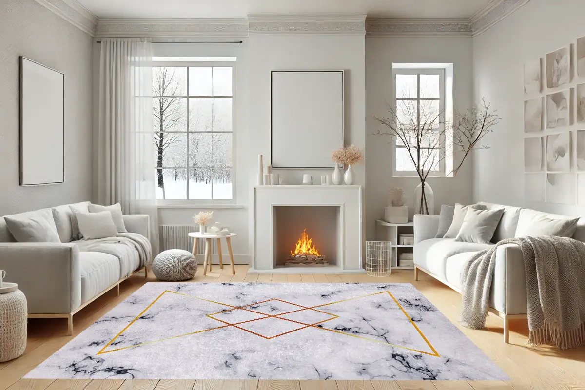 Add a touch of luxury to your home with the Golden Geometric Marble Rug. This rug features a marble-inspired backdrop with striking golden geometric accents that exude sophistication and contemporary charm. The intricate interplay of textures and metallic hues makes it a statement piece in any room, effortlessly blending modern aesthetics with timeless elegance. Made from hypoallergenic, pet-friendly materials, this rug is designed for durability and comfort. Its non-slip backing…