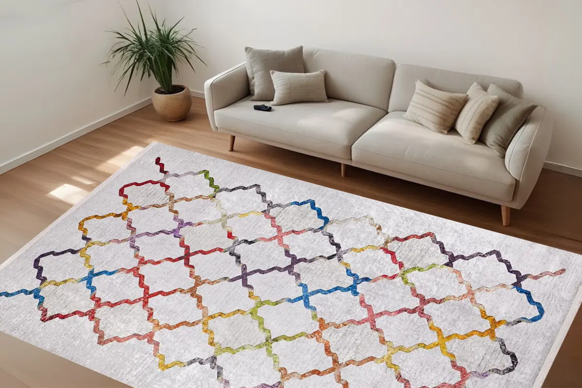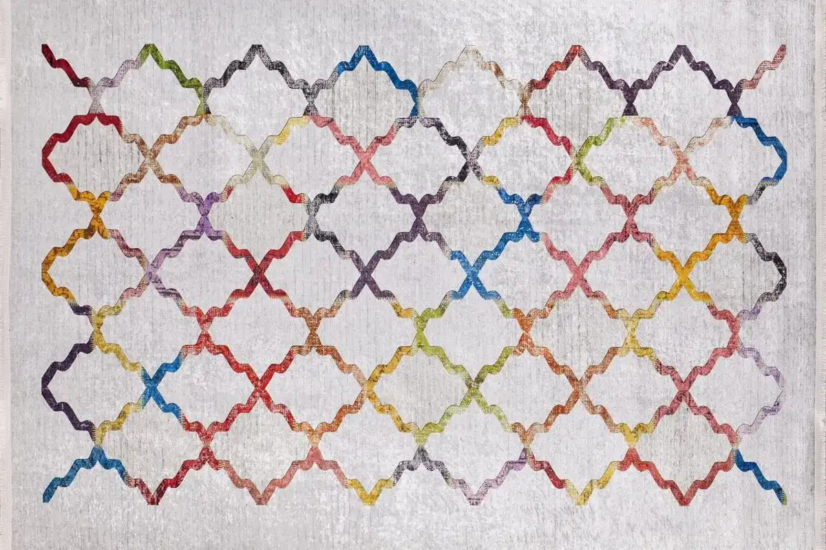 Bring a splash of color and energy to your living space with the Vibrant Mosaic Rug. Featuring a geometric trellis pattern in a spectrum of vivid hues on a neutral background, this design effortlessly adds a contemporary touch to any room. Perfect for living rooms, bedrooms, or creative spaces, its high-quality fabric ensures long-lasting durability and softness underfoot. Ideal for those looking to brighten their interiors with a playful yet…